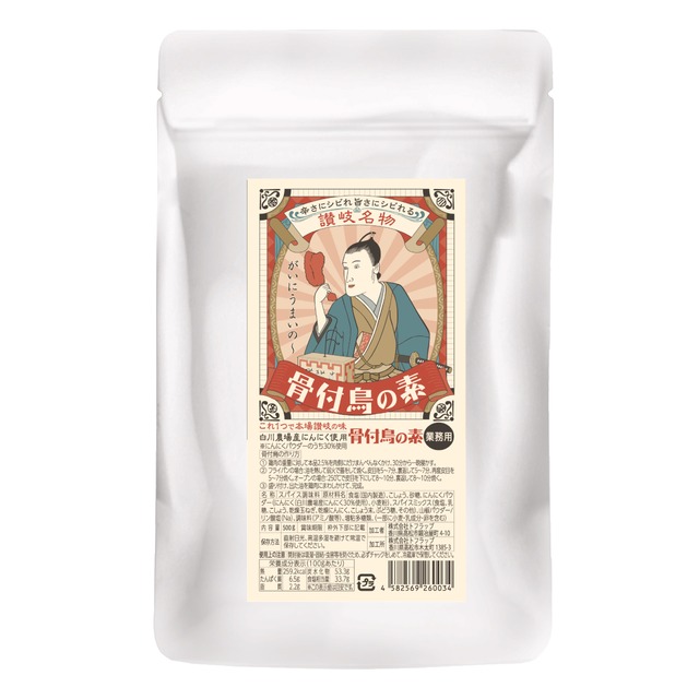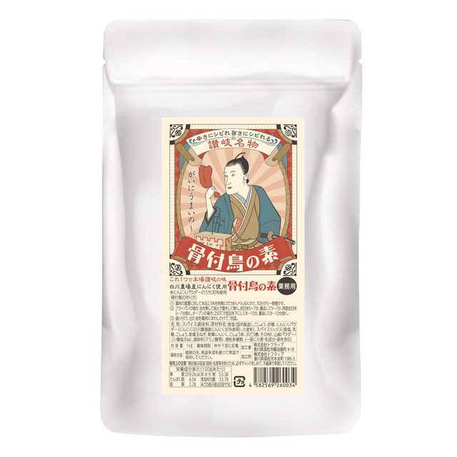 業務用サイズです! ★香川県自慢のご当地グルメ「骨付鳥」がこれひとつで簡単に再現!★ 香川県民にはもうお馴染み、ガツンとくるスパイシーでガーリックな“あの”味付けはお酒にもご飯にも相性バツグン! スーパーで買ってきた鶏もも肉に振りかけて、フライパンで焼くだけでご家庭で簡単プロの味。 【プロの料理人が開発!】 お店で食べるイメージが強い骨付鳥ですが、その“お店”側の料理人が開発いたしました。17年以上飲食店を営んでいる弊社に在籍するプロの料理人が、こだわり抜いて作った商品です。調味料の配合は勿論、使用するにんにくの一部には、香川県のにんにく専門農家「白川農場」様の上質なにんにくを使用するこだわりっぷり。 香川県民の皆様にはぜひご賞味いただいて本場の目でご評価ください。骨付鳥を初めて知ったという方々も香川自慢のソウルフードをぜひ味わってみてください! 【作り方】 ①鶏もも肉に「骨付鳥の素」を振りかけ、30分~1晩寝かす。 ②油をひき、皮目を5~7分、身側を5~7分、もう一度皮目を5~7分焼く。 ③盛り付け、出た油を回しかけて完成! ※鶏もも肉約4枚分の味付けができます。 もも肉以外でも鶏肉ならどの部位でも合います! アレンジレシピは画像QRコードから♪ 【内容量】500g 【原材料】食塩(国内製造),こしょう,砂糖,にんにくパウダー(にんにく(白川農場産にんにく30%使用),小麦粉),スパイスミックス(食塩,乳糖,こしょう,乾燥玉ねぎ,乾燥にんにく,こしょう末,ぶどう糖,その他),山椒パウダー/リン酸塩(Na),増粘多糖類,(一部に小麦・乳成分・卵を含む) 【賞味期限】製造日より15ヵ月 【容器】チャック付きアルミ袋